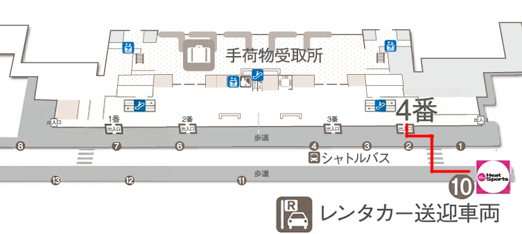 お荷物を受け取られたのち店舗へとお電話おかけいただけますと、⑭番を越えた先にあるレンタカー送迎車乗降場のヒートスポーツレンタカー合流場所までご案内させていただきます。
